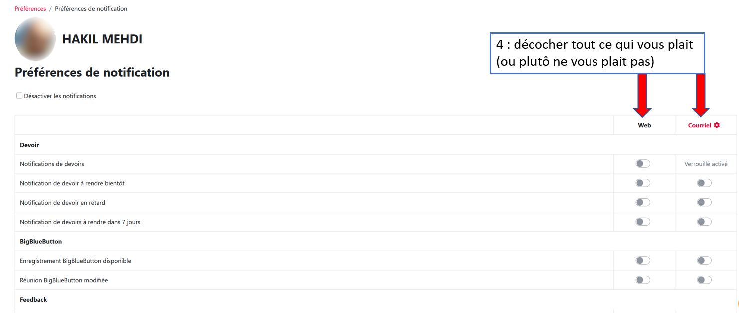 Attention, les manipulations suivantes ne permettent pas d'emêcher l'envoi de notifications lorsque les participants remettent un "devoir", cette option étant "activée verouillée".