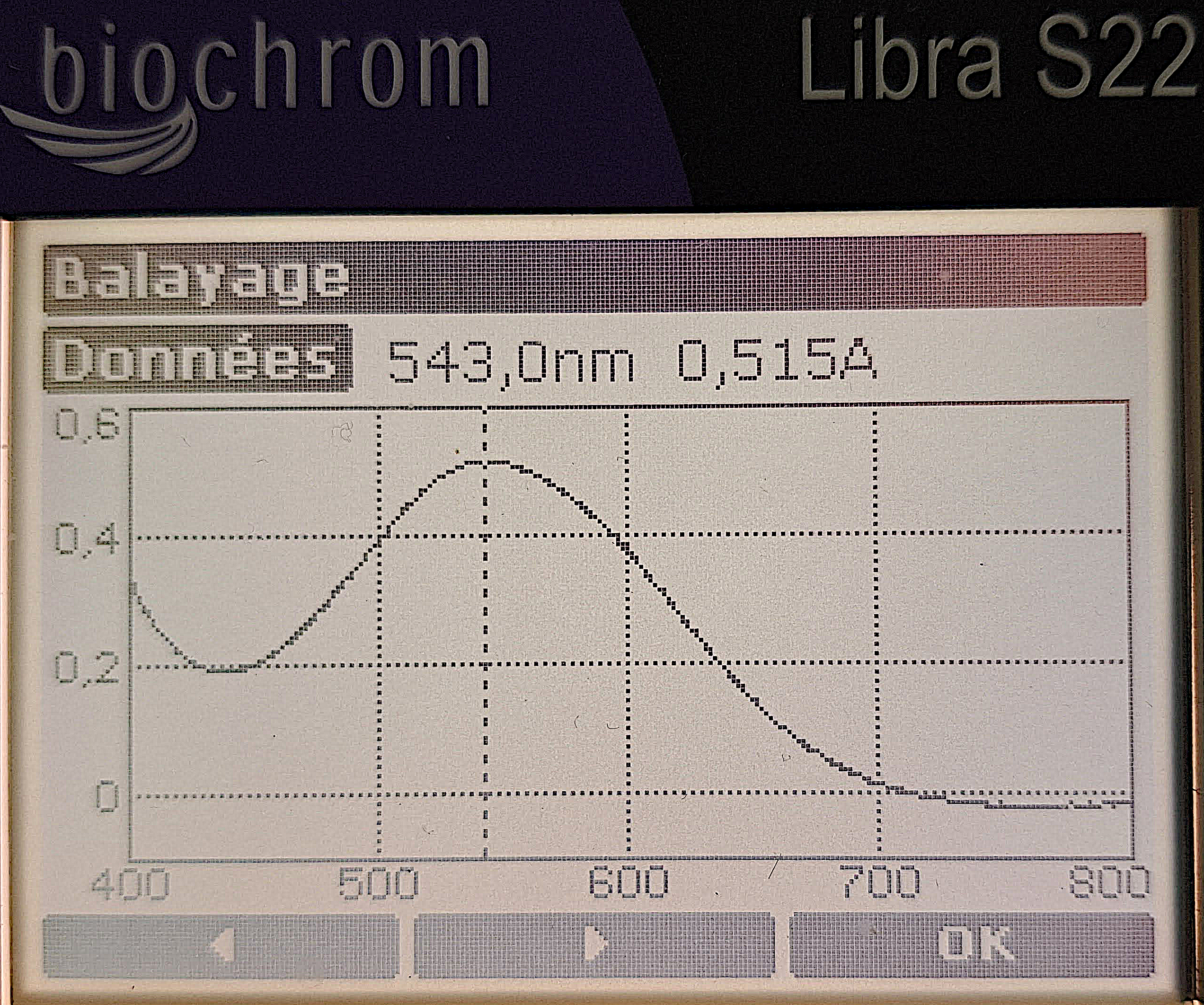 Spectre d'absorption du "multicalibrator Biolabo 95015" dilué d=1/10 (sérum origine bovine lyophylisé reconstitué) : couleur, jaune "fluo"