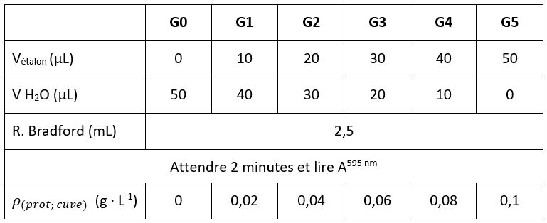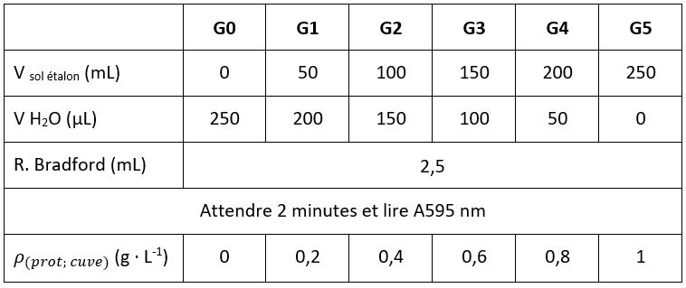 Solution étalon de protéines : ρ(protéines ; étalon) = 0,5 g · L-1